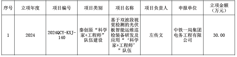 近日,中鐵一局電務公司牽頭申報的基于雙波段視覺檢測的光伏板智能運維巡檢裝備研發及應用“科學家+工程師”隊伍,成功入選2023年度秦創原“科學家+工程師”隊伍建設。