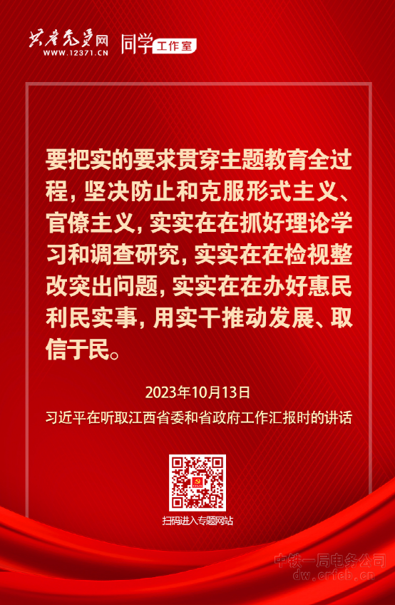 2023年10月13日,習(xí)近平總書記在聽取江西省委和省政府工作匯報(bào)時(shí)指出,要總結(jié)運(yùn)用第一批主題教育的成功經(jīng)驗(yàn),高質(zhì)量開展第二批主題教育,用井岡山精神、蘇區(qū)精神、長征精神砥礪黨員、干部,教育引導(dǎo)黨員、干部堅(jiān)定理想信念、牢記初心使命、積極開拓進(jìn)取、勇于擔(dān)當(dāng)作為。要把實(shí)的要求貫穿主題教育全過程,堅(jiān)決防止和克服形式主義、官僚主義,實(shí)實(shí)在在抓好理論學(xué)習(xí)和調(diào)查研究,實(shí)實(shí)在在檢視整改突出問題,實(shí)實(shí)在在辦好惠民利民實(shí)事,用實(shí)干推動(dòng)發(fā)展、取信于民?!军c(diǎn)擊學(xué)習(xí)】
