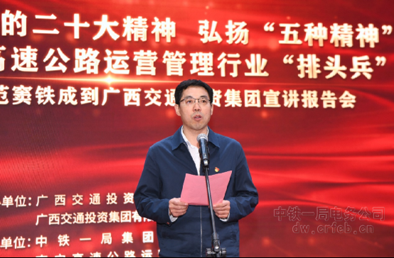 2月24日,由廣西交通投資集團有限公司主辦,中鐵一局集團有限公司、南寧高速公路運營有限公司承辦的“學習宣傳貫徹黨的二十大精神,弘揚‘五種精神’奮力建成全國高速公路運營管理行業‘排頭兵’——全國勞模、全國優秀共產黨員竇鐵成宣講報告會在廣西南寧舉辦。廣西交投集團副總經理陳智杰,中鐵一局集團副總經理尚武孝出席了報告會。