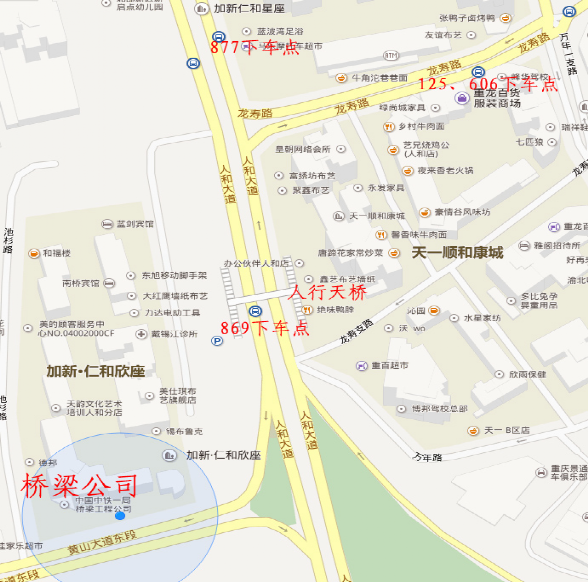 乘坐869路公交車,到人和(人和站馬路兩邊站點均停車,第二次停車<第一次停車為后附地圖中877下車點>)下車,前方右側即可看到公司,前行拐角處右轉后下行100米右側即到;