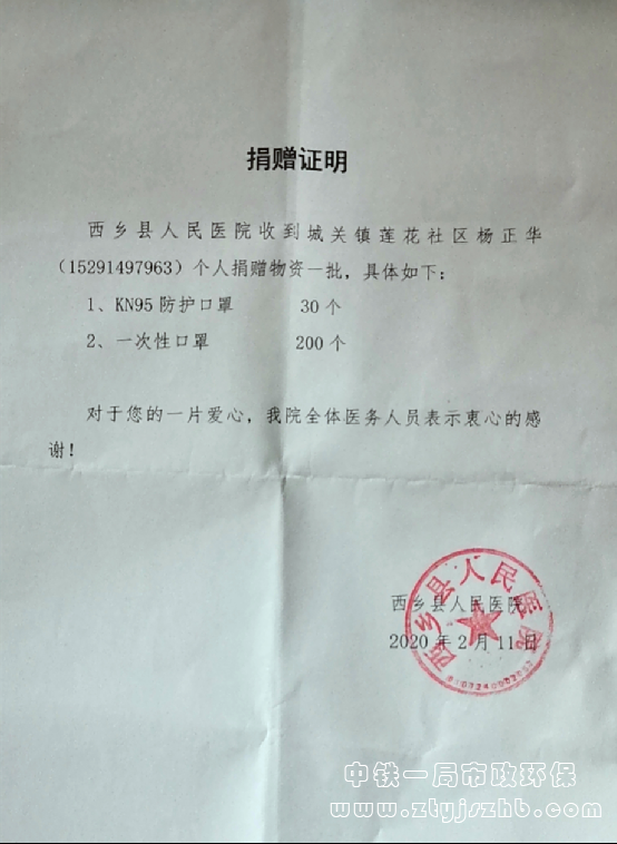 同是90后的青年職工楊正華春節(jié)回到家鄉(xiāng)漢中市西鄉(xiāng)縣后,得知10萬人口的小縣城已經(jīng)有10例確診患者,疫情防控形勢(shì)非常嚴(yán)峻。當(dāng)他從縣醫(yī)院上班的妹妹那知道縣醫(yī)院的防護(hù)物資十分緊缺后,便開始在網(wǎng)上四處購買物資,最終購買到KN95口罩30個(gè),一次性外科口罩200個(gè),全部捐給縣醫(yī)院。