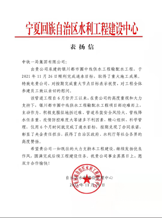寧夏回族自治區(qū)水利工程建設(shè)中心表揚(yáng)信